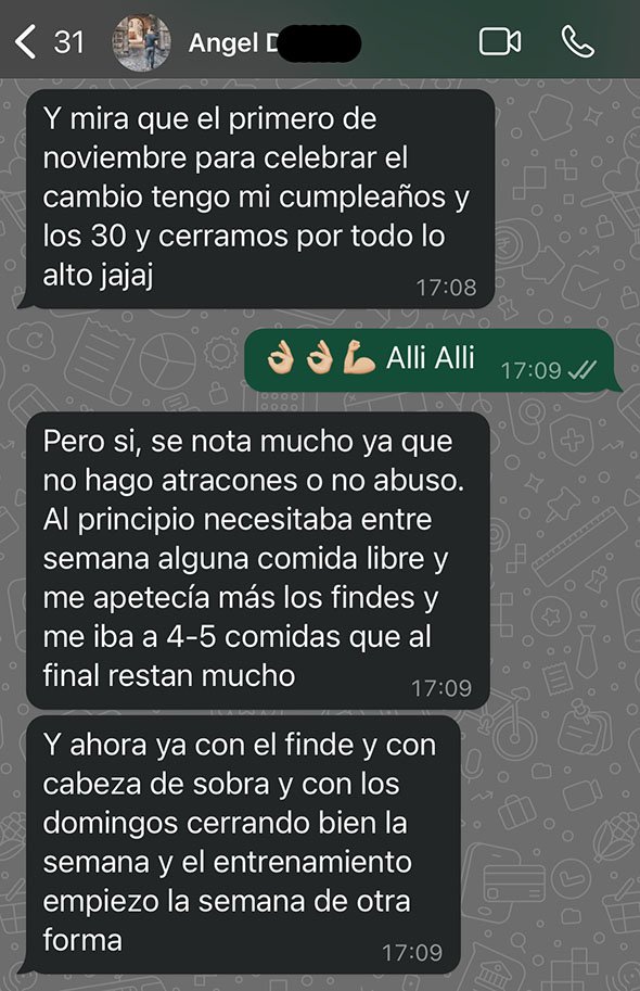 • Aprender a gestionar muchas comidas fuera del plan y compromisos, sin dejar de progresar, tomando consciencia de ellas, aplicando estrategias y compensando con otras semanas donde aprieta y sigue todo al dedillo.
