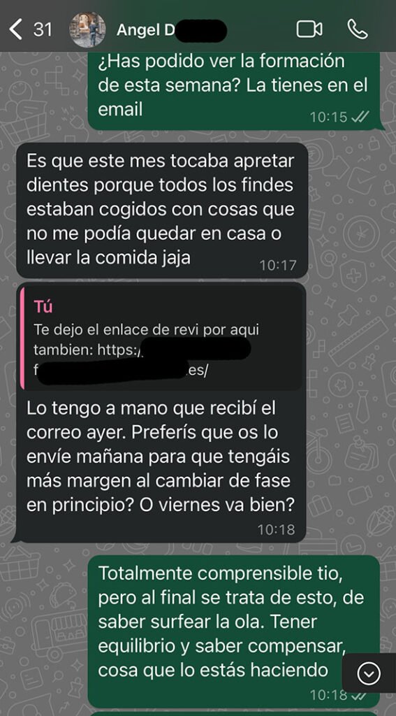 Hasta ahora todos sus intentos se habían basado en el «sacrificio» y la «disciplina por rachas». Y vio que en nuestra forma de trabajar no existía esa presión por hacerlo todo perfecto —cosa que es imposible—, y encima, añadíamos formación para que se supiera en todo momento el por qué de lo que hacíamos.