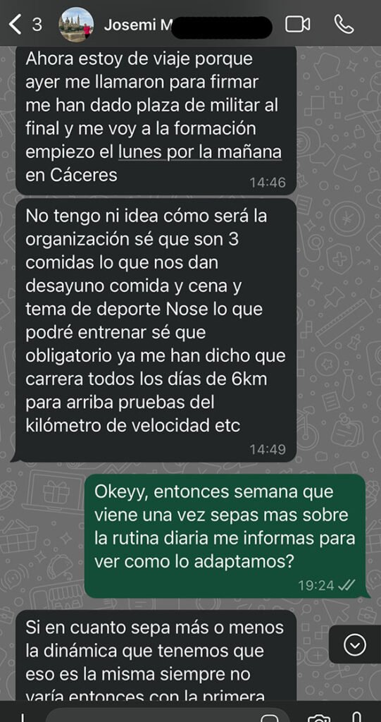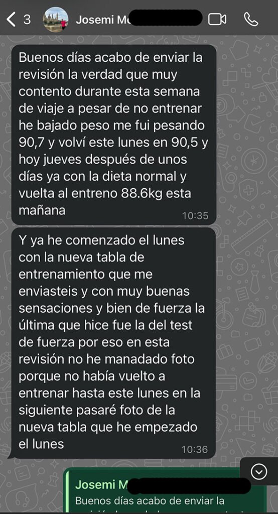 Josemi terminó su fase de Espartano entornos los 82-83kg, y tras eso tuvo que entrar en una Academia Militar, con lo que pausamos su proceso.